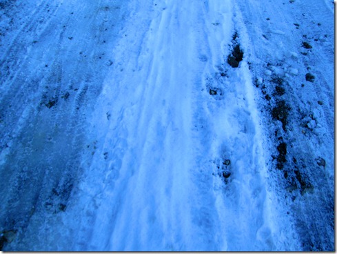 Very quickly, the road filled with snow and ice. At first it wasn’t thick, but it was tremendously icy. I learned almost immediately to run the trail edges, to stay in the white stuff.